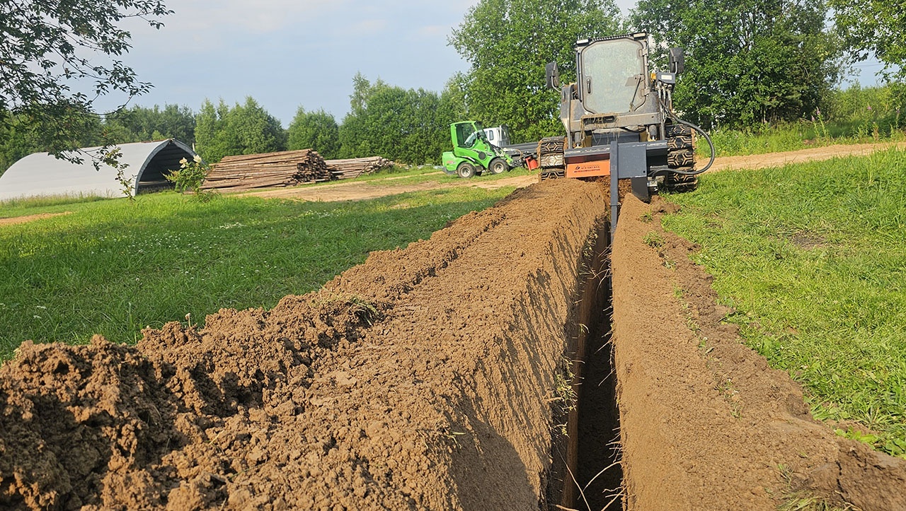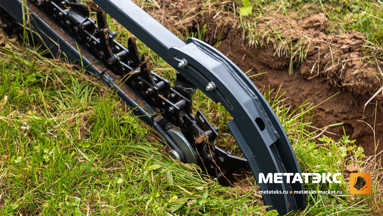 Траншеекопатель предназначен для рытья траншей. Он обеспечивает точное соблюдение глубины и ширины траншеи. Комбинированная цепь в базовой комплектации. Возможно увеличение ширины цепи до 240 мм при помощи комплекта расширителей и изменение конфигурации цепи при помощи комплектации только ковшовыми зубьями (для мягкого грунта) или только резцовыми зубьями (для мерзлой и каменистой почвы).